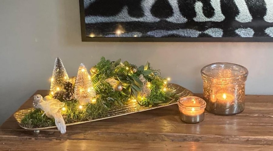 Langwerpige gouden schaal van 60 cm wordt opgemaakt met diverse groenmaterialen, mini boompjes, gouden vogel, kerstballetjes en lampjes op batterijen