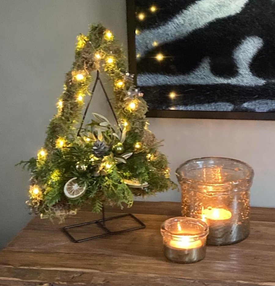 wordt bekleed met mos en diverse groenmaterialen, kerstballetjes en versieringen
